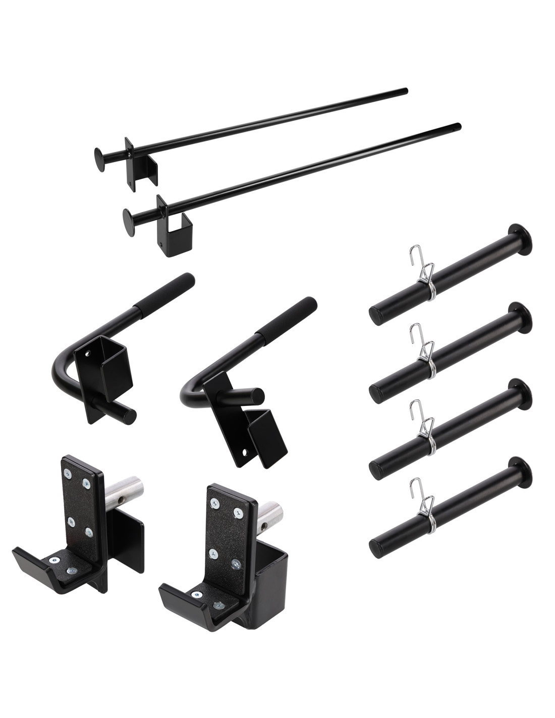 Der Trainingskäfig verfügt über vier Stifte, an denen Sie bequem Hantelscheiben aufbewahren oder an dehnbaren Gummibändern trainieren können. Die vier mitgelieferten Federklemmen sorgen für zusätzlichen Komfort bei der Verwendung der Gewichte. Der Trainer kann seine Füße auch auf spezielle, rutschfeste Füße stellen, um bestimmte Übungen bequem ausführen zu können.