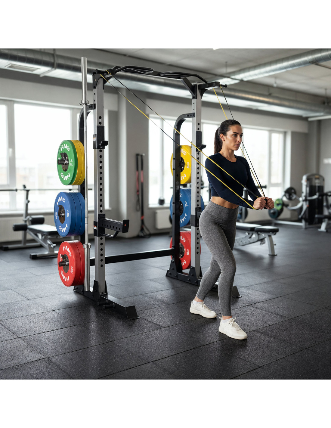Das HMS Fitness KLT5432 Power Rack ist mit zusätzlichen Halterungen zur Befestigung von Widerstandsbändern ausgestattet, die sowohl im oberen als auch im unteren Bereich der Konstruktion angebracht sind. Dadurch erweitern sich die Trainingsmöglichkeiten erheblich und ein effektives Training mit Power Bands wird ermöglicht.