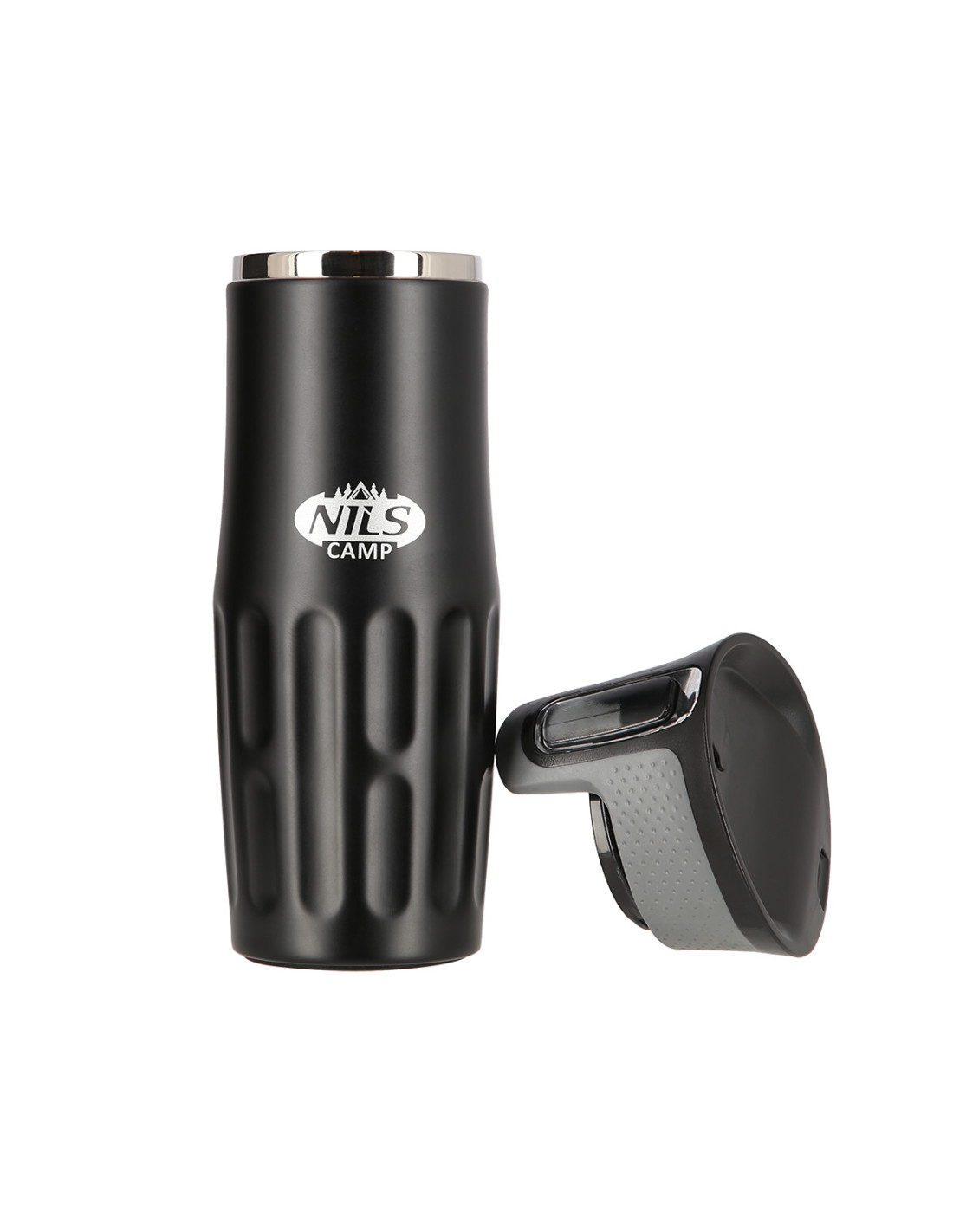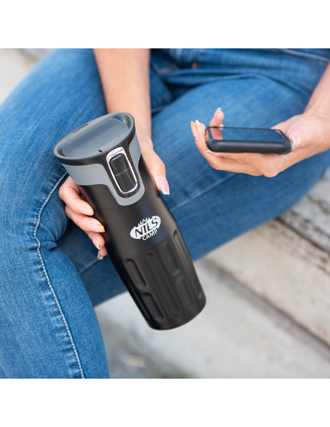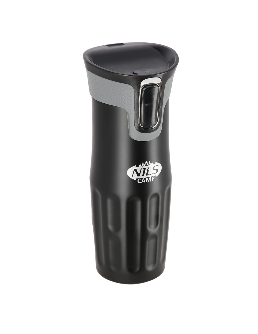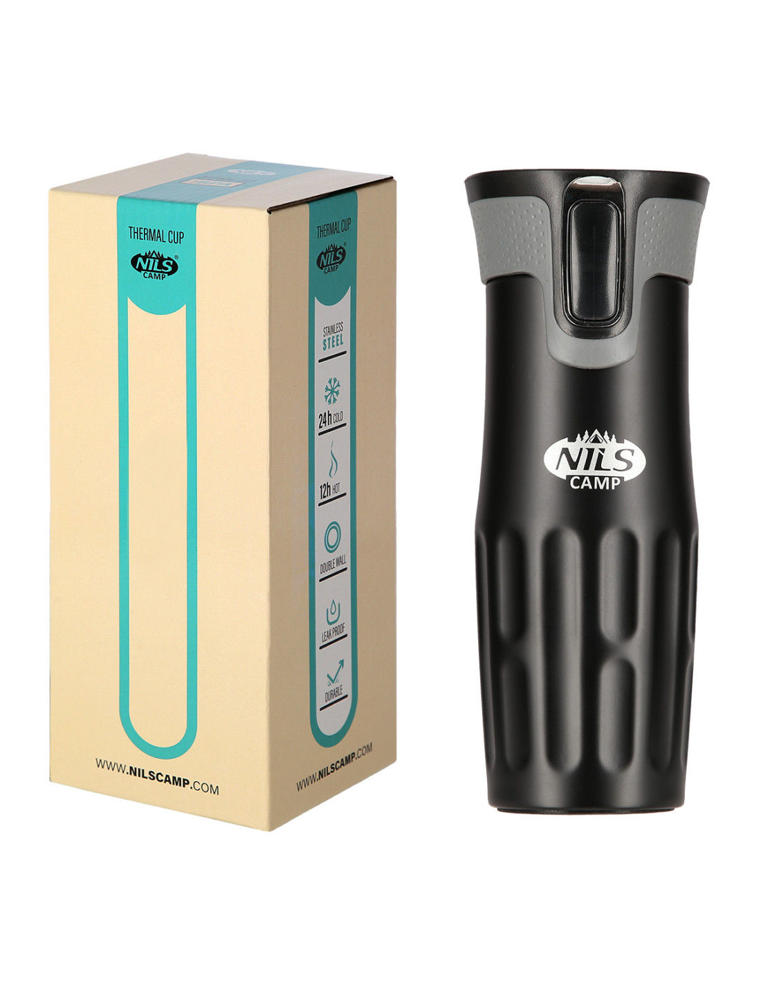Der Thermobecher NCC06 der Marke NILS CAMP zeichnet sich sowohl durch eine einfache Konstruktion als auch durch sein originelles Design aus! NCC06 ist doppelwandig und aus rostfreiem Stahl hergestellt, daher hält er die eingefüllten Getränke warm bis zu 12 Stunden und kalt bis zu 24 Stunden. Der Thermobecher NCC06 hat ein sehr innovatives Öffnungssystem. Wenn man trinken möchte, soll man den Druckknopf drücken und gedrückt halten. Das Verringelungssystem wird geöffnet. Um den Thermobecher zu schließen, reicht es, den Durckknopf zu lösen. Ein großer Vorteil ist auch die rutschfeste Unterseite des Bechers aus Gummi, was vor dem Verschütten des heißen Kaffes oder Tees schützt, wenn der Thermobecher geöffnet ist!