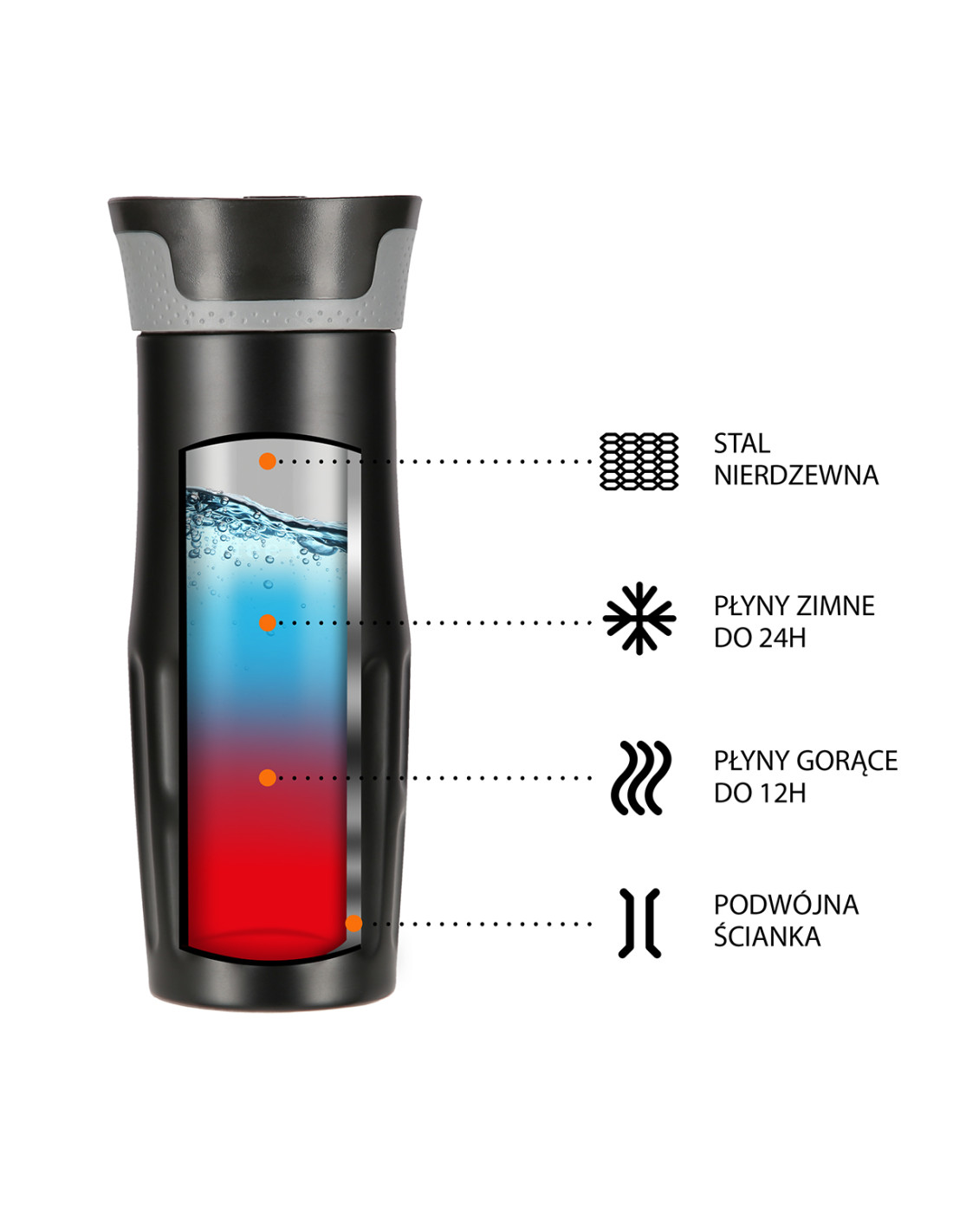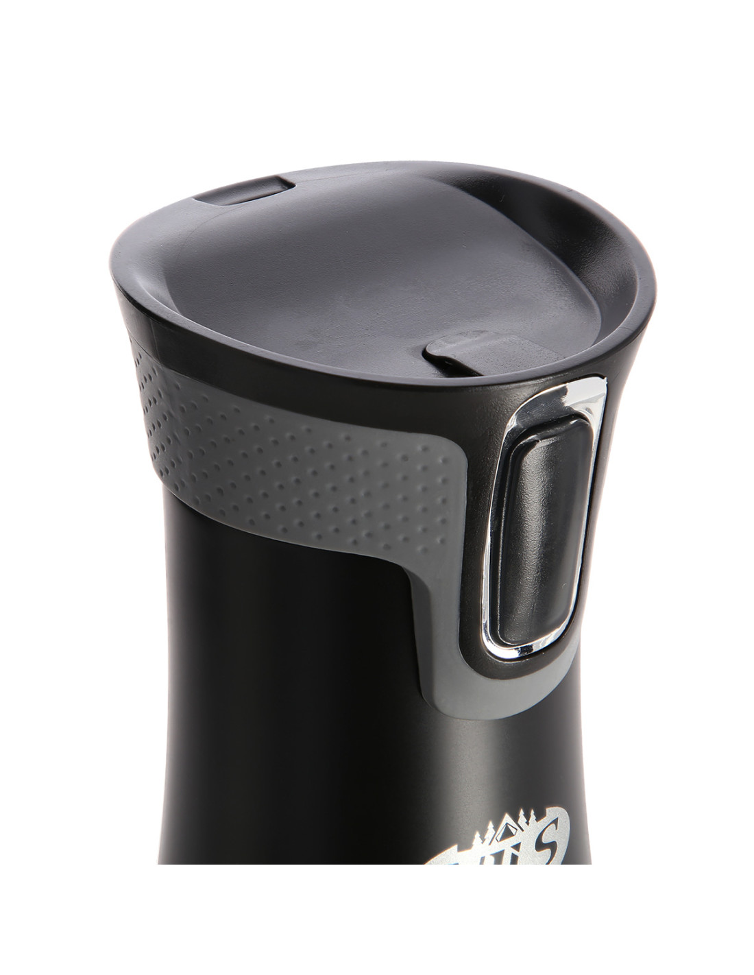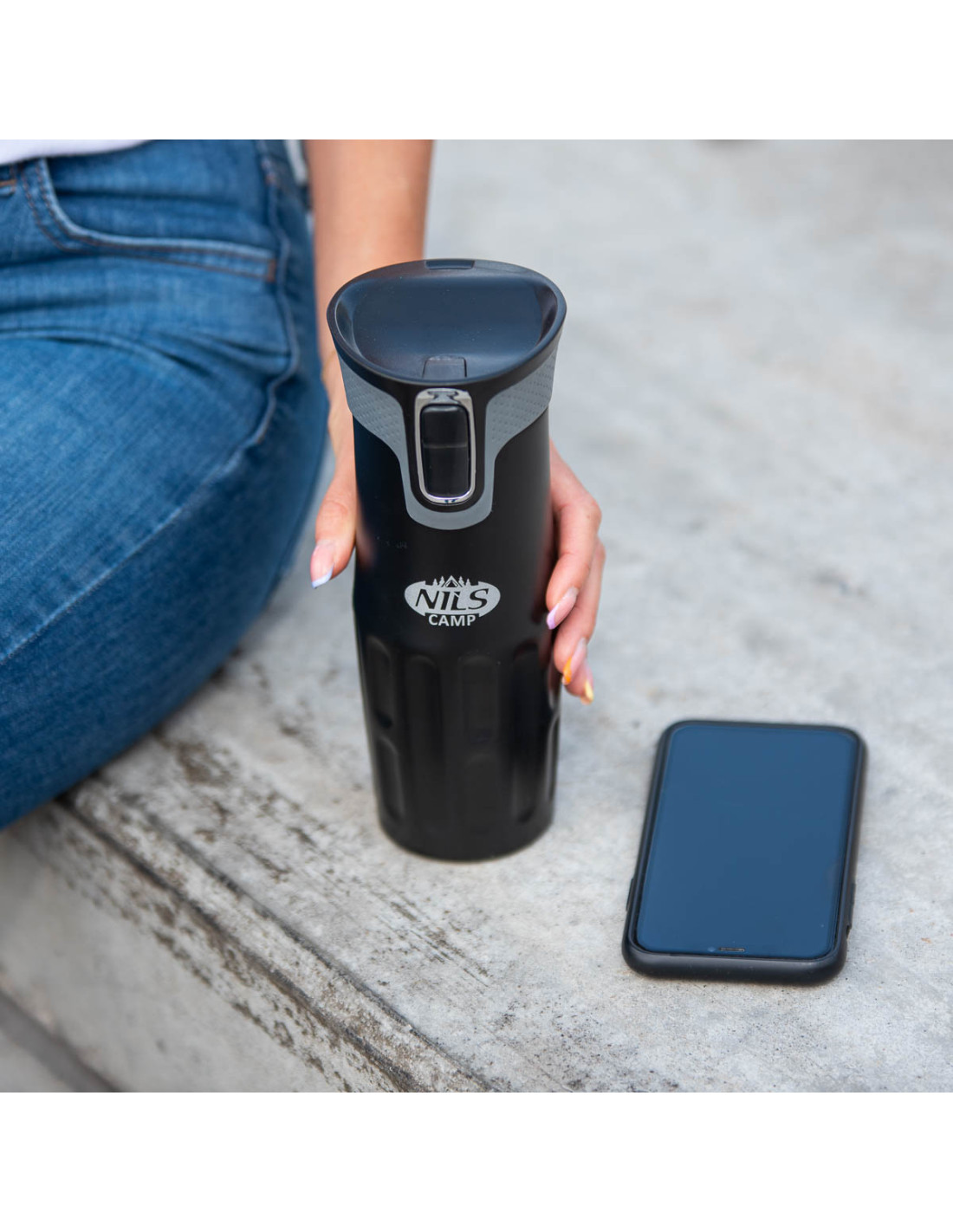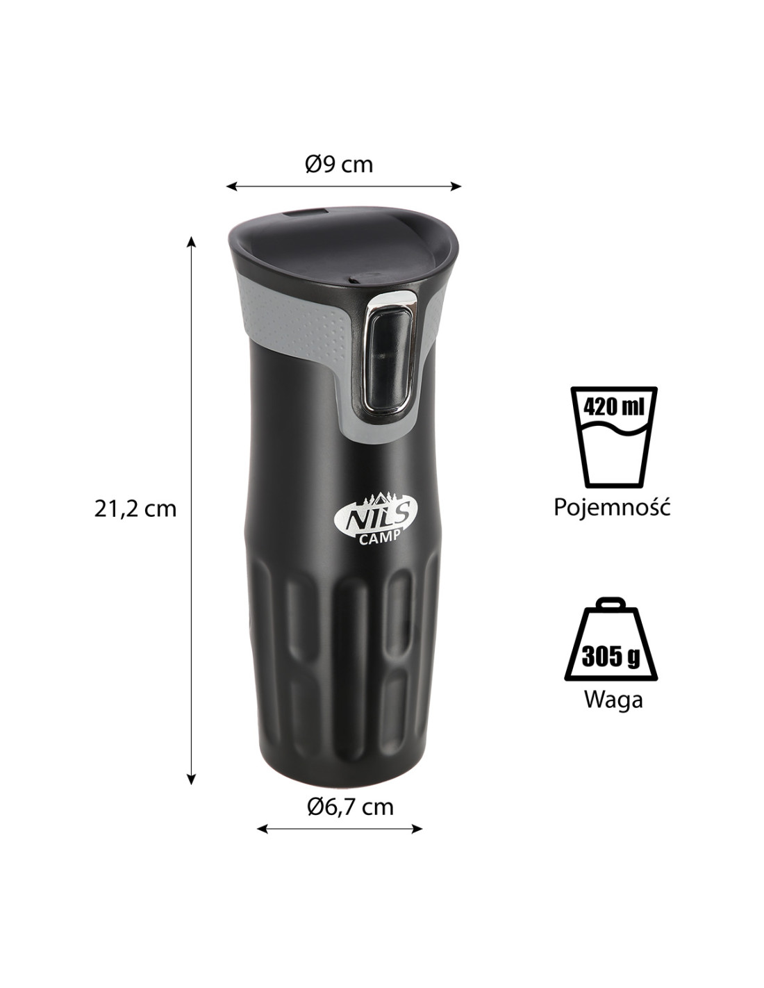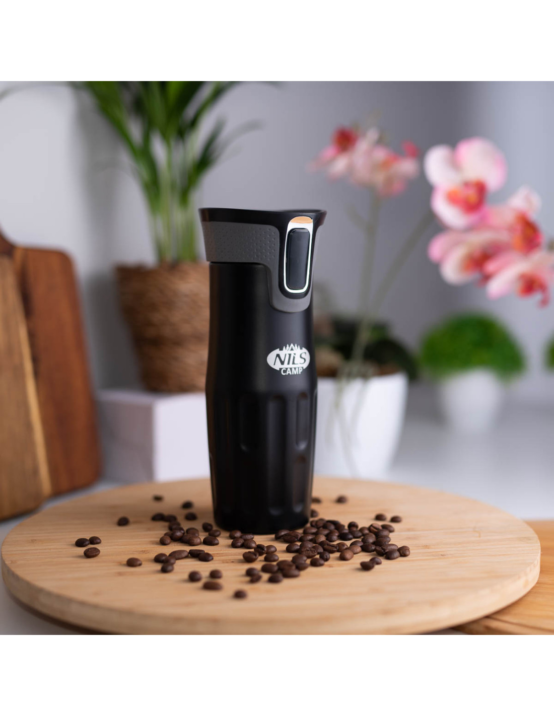 Der Thermobecher NCC06 der Marke NILS CAMP zeichnet sich sowohl durch eine einfache Konstruktion als auch durch sein originelles Design aus! NCC06 ist doppelwandig und aus rostfreiem Stahl hergestellt, daher hält er die eingefüllten Getränke warm bis zu 12 Stunden und kalt bis zu 24 Stunden. Der Thermobecher NCC06 hat ein sehr innovatives Öffnungssystem. Wenn man trinken möchte, soll man den Druckknopf drücken und gedrückt halten. Das Verringelungssystem wird geöffnet. Um den Thermobecher zu schließen, reicht es, den Durckknopf zu lösen. Ein großer Vorteil ist auch die rutschfeste Unterseite des Bechers aus Gummi, was vor dem Verschütten des heißen Kaffes oder Tees schützt, wenn der Thermobecher geöffnet ist!