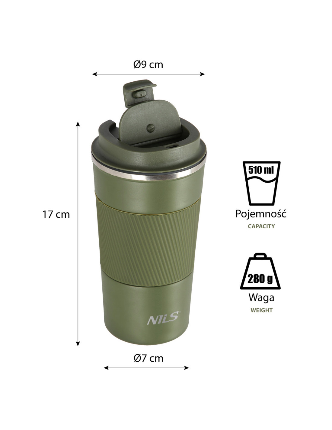 Der Thermobecher NCC09 der Marke NILS zeichnet sich sowohl durch eine einfache Konstruktion als auch durch sein originelles Design aus! NCC09 ist doppelwandig und aus rostfreiem Stahl hergestellt, daher hält er die eingefüllten Getränke warm bis zu 12 Stunden und kalt bis zu 24 Stunden. Der Thermobecher NCC09 hat ein sehr bequemes Öffnungssystem. Es reicht nur den Druckknopf zu drücken. Ein großer Vorteil des Thermobechers ist das gummierte Greiffteil, was das Halten des Produkts erleichtert und die Sicherheit beim Transport erhöht.