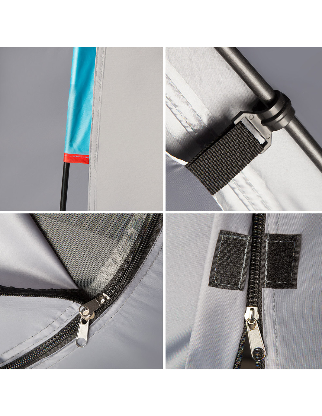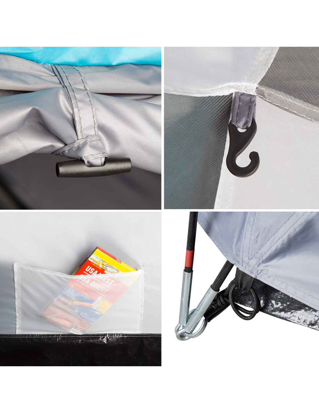 Darüber hinaus ist das Zelt mit zwei Innentaschen zum Verstauen praktischer Gegenstände und mit einer Halterung unter der Decke zum Aufhängen einer Lampe ausgestattet.