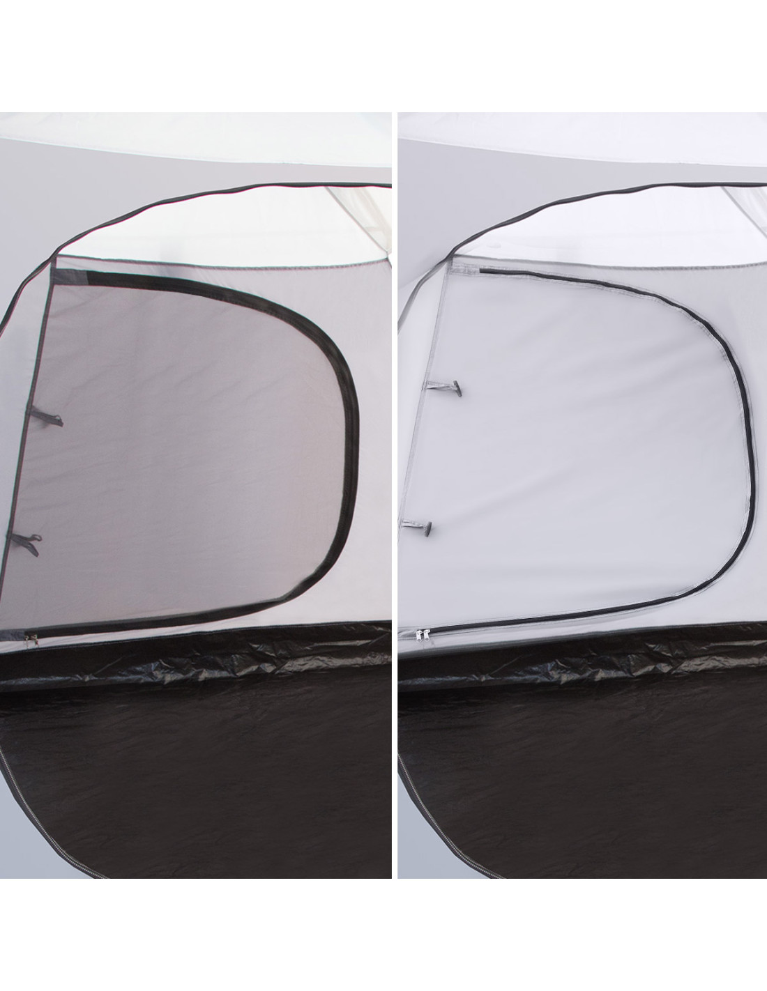 Die Schlafkabine, die über eine Belüftungsöffnung in der Decke verfügt, besteht aus einem atmungsaktiven Material, das vor Kondensation von Wasserdampf schützt. Die beiden Eingänge zur Schlafkabine können mit einem Moskitonetz geschlossen werden. Außerdem gibt es einen großen Haupteingang im Vorraum. All dies führt zu einem hohen Maß an Belüftung und Luftzirkulation, was sich in einem langen und angenehmen Schlaf niederschlägt.