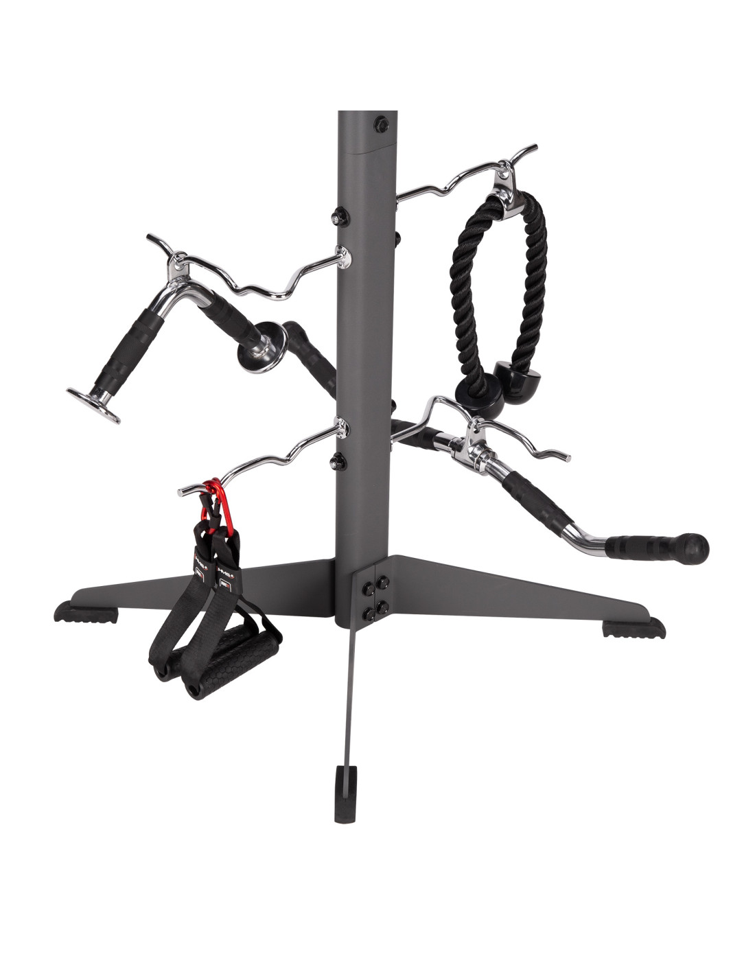 STR33 ist ein Ständer, der breite Füße im unteren Teil hat, was für hohe Stabilität und Robustheit sorgt. Der Ständer ist mit acht unabhängigen Haken ausgestattet, auf denen Sie unterschiedliche Arten von Fitnesszubehör (wie z.B. Springseile, Griffe oder Seile) aufhängen können. Jeder Haken hat eine maximale Belastbarkeit von 30 kg, daher müssen Sie sich keine Sorgen über die Beschädigung des Ständers oder Zubehörs sorgen.