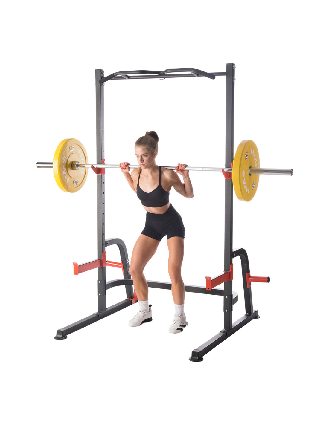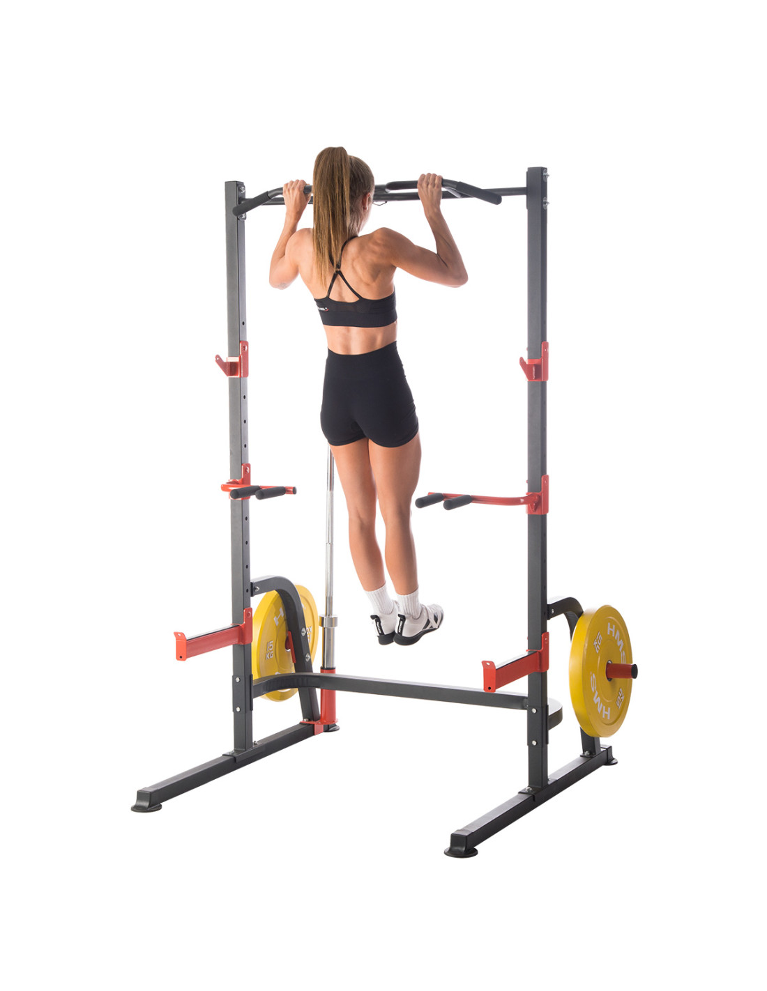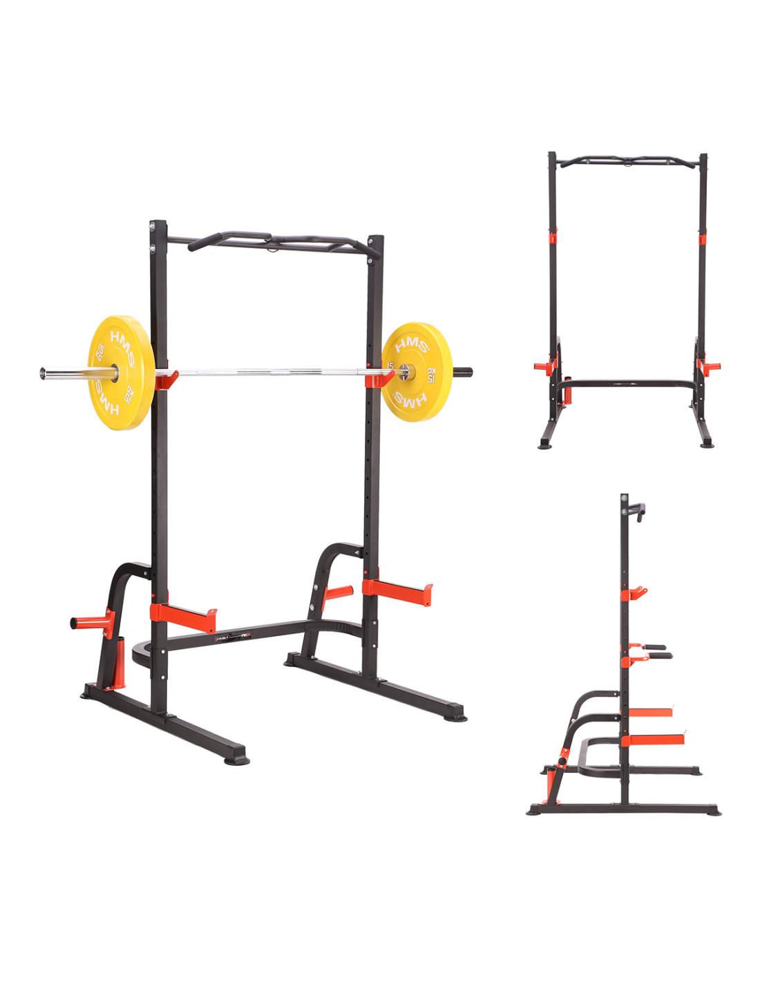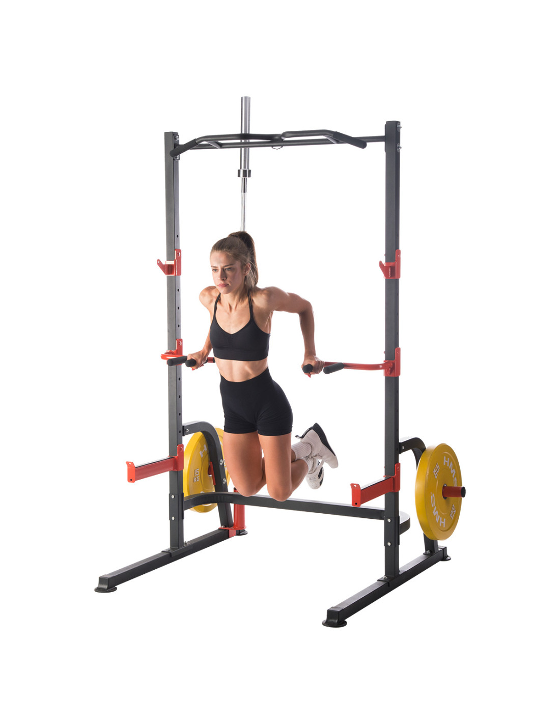 Multi-Ständer PWS08 der Marke HMS ist mit einem Griff für Langhantel und mit Sicherheitshaken ausgestattet, daher können Sie sicher und selbstständig Krafttraining mit extra Belastung durchführen. Die Klimmzugstange und die Dip-Station können Sie bei Calisthenics-Übungen verwenden, bei denen Sie Ihr Körpergewicht nutzen. Die Griffe kann man auch bei Übungen mit Trainingsbank verwenden. Dip-Station, Griffe für Langhantel und Sicherheitshaken sind höhenverstellbar. Die ganze Konstruktion ist aus Stahl hergestellt, daher ist sie robust. Die große Breite der Basis ermöglicht es, dynamische Training mit einer großen Belastung zu machen.