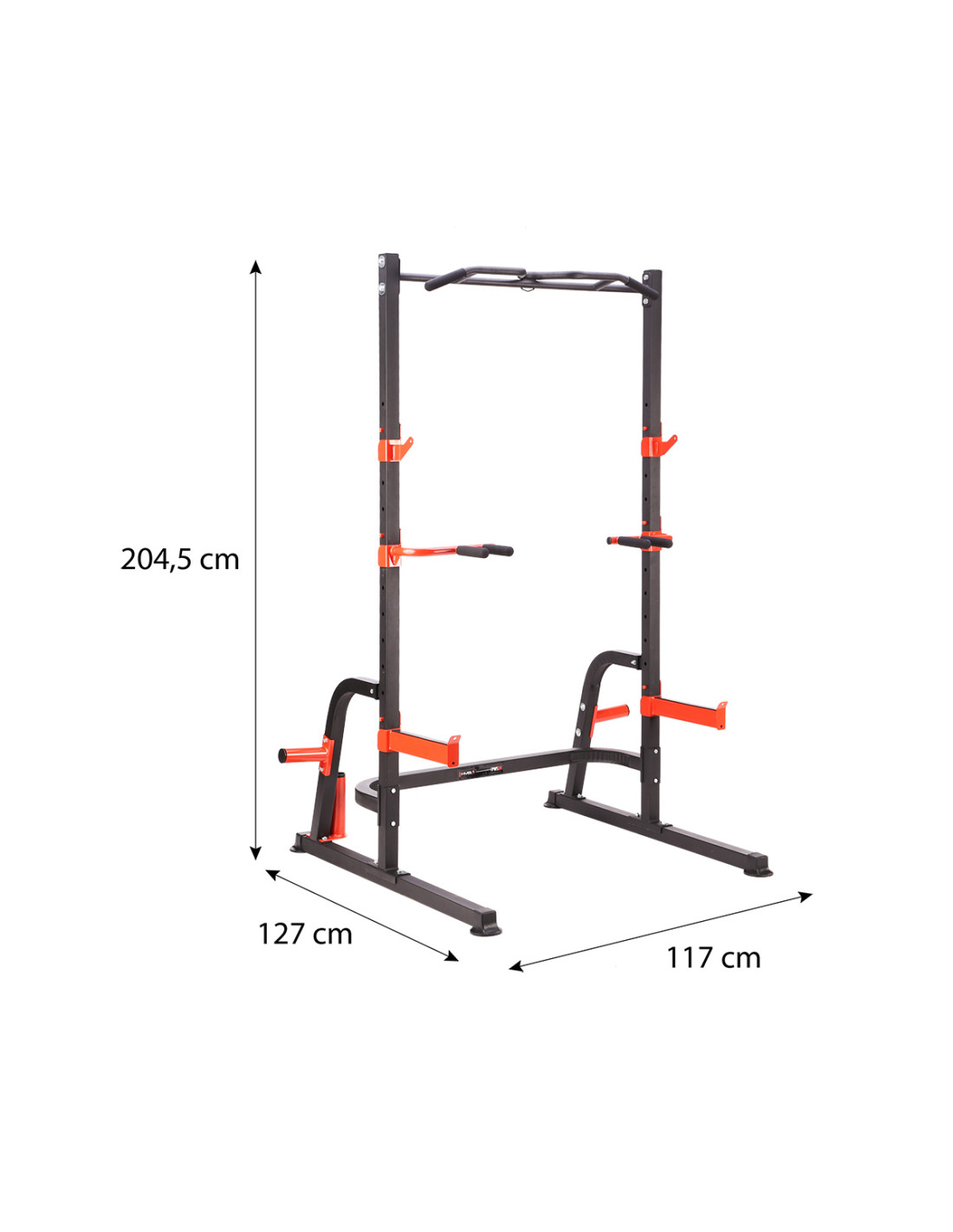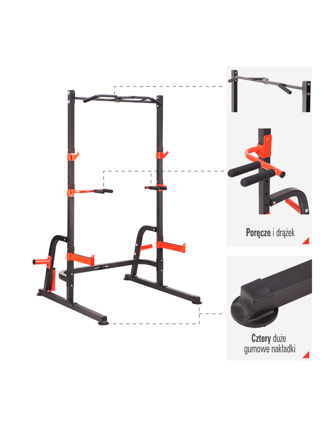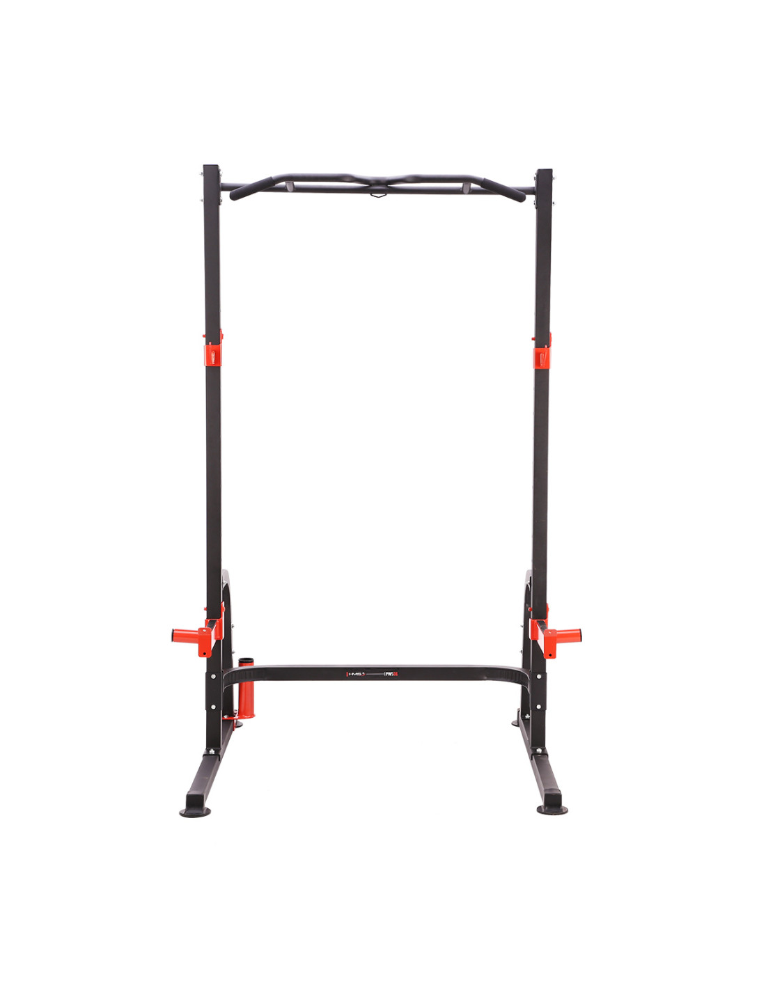 Multi-Ständer PWS08 der Marke HMS ist mit einem Griff für Langhantel und mit Sicherheitshaken ausgestattet, daher können Sie sicher und selbstständig Krafttraining mit extra Belastung durchführen. Die Klimmzugstange und die Dip-Station können Sie bei Calisthenics-Übungen verwenden, bei denen Sie Ihr Körpergewicht nutzen. Die Griffe kann man auch bei Übungen mit Trainingsbank verwenden. Dip-Station, Griffe für Langhantel und Sicherheitshaken sind höhenverstellbar. Die ganze Konstruktion ist aus Stahl hergestellt, daher ist sie robust. Die große Breite der Basis ermöglicht es, dynamische Training mit einer großen Belastung zu machen.