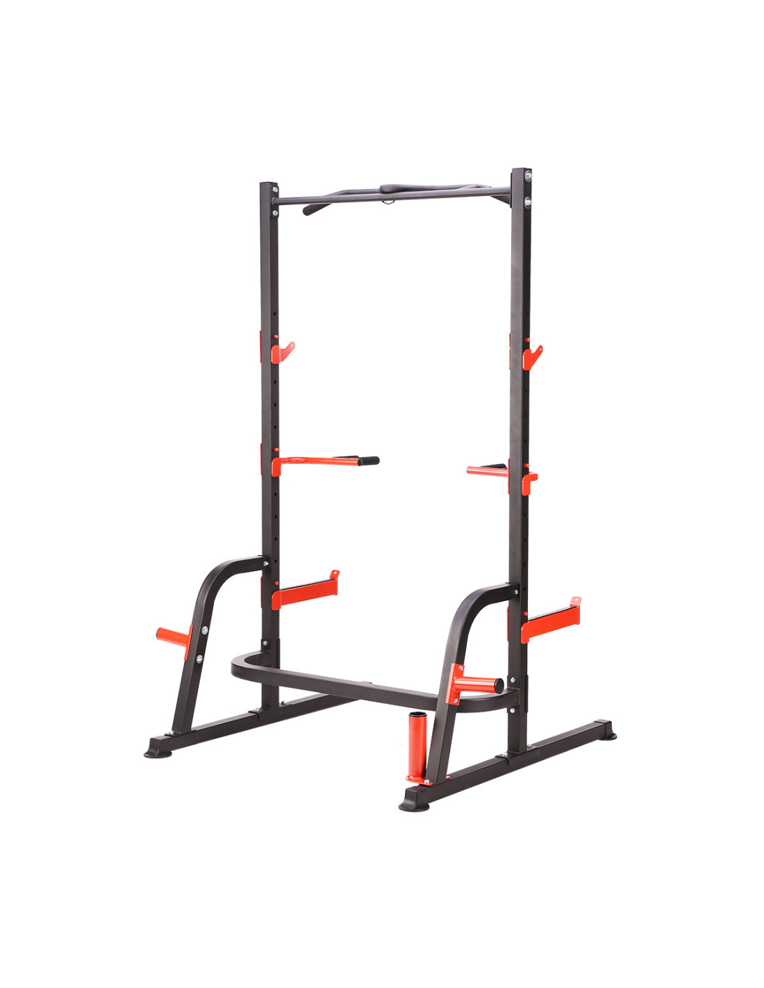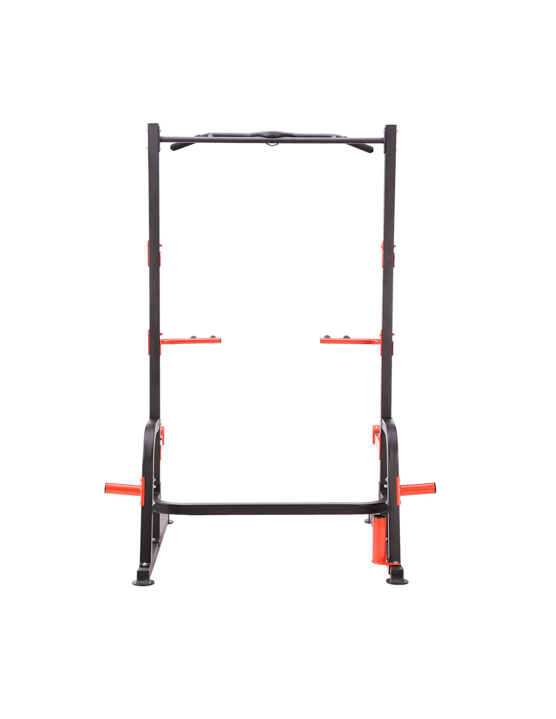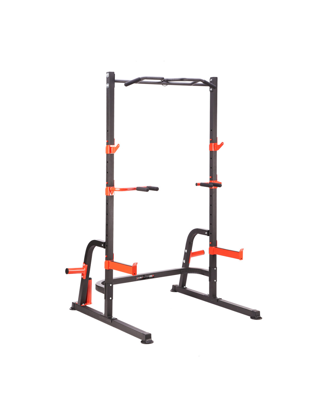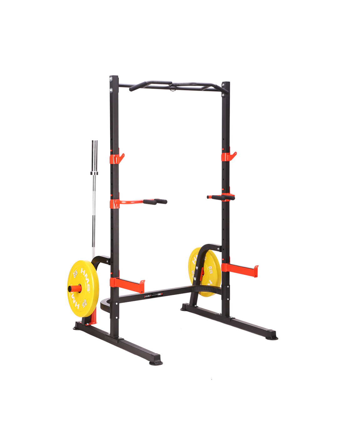 Multi-Ständer PWS08 der Marke HMS ist mit einem Griff für Langhantel und mit Sicherheitshaken ausgestattet, daher können Sie sicher und selbstständig Krafttraining mit extra Belastung durchführen. Die Klimmzugstange und die Dip-Station können Sie bei Calisthenics-Übungen verwenden, bei denen Sie Ihr Körpergewicht nutzen. Die Griffe kann man auch bei Übungen mit Trainingsbank verwenden. Dip-Station, Griffe für Langhantel und Sicherheitshaken sind höhenverstellbar. Die ganze Konstruktion ist aus Stahl hergestellt, daher ist sie robust. Die große Breite der Basis ermöglicht es, dynamische Training mit einer großen Belastung zu machen.