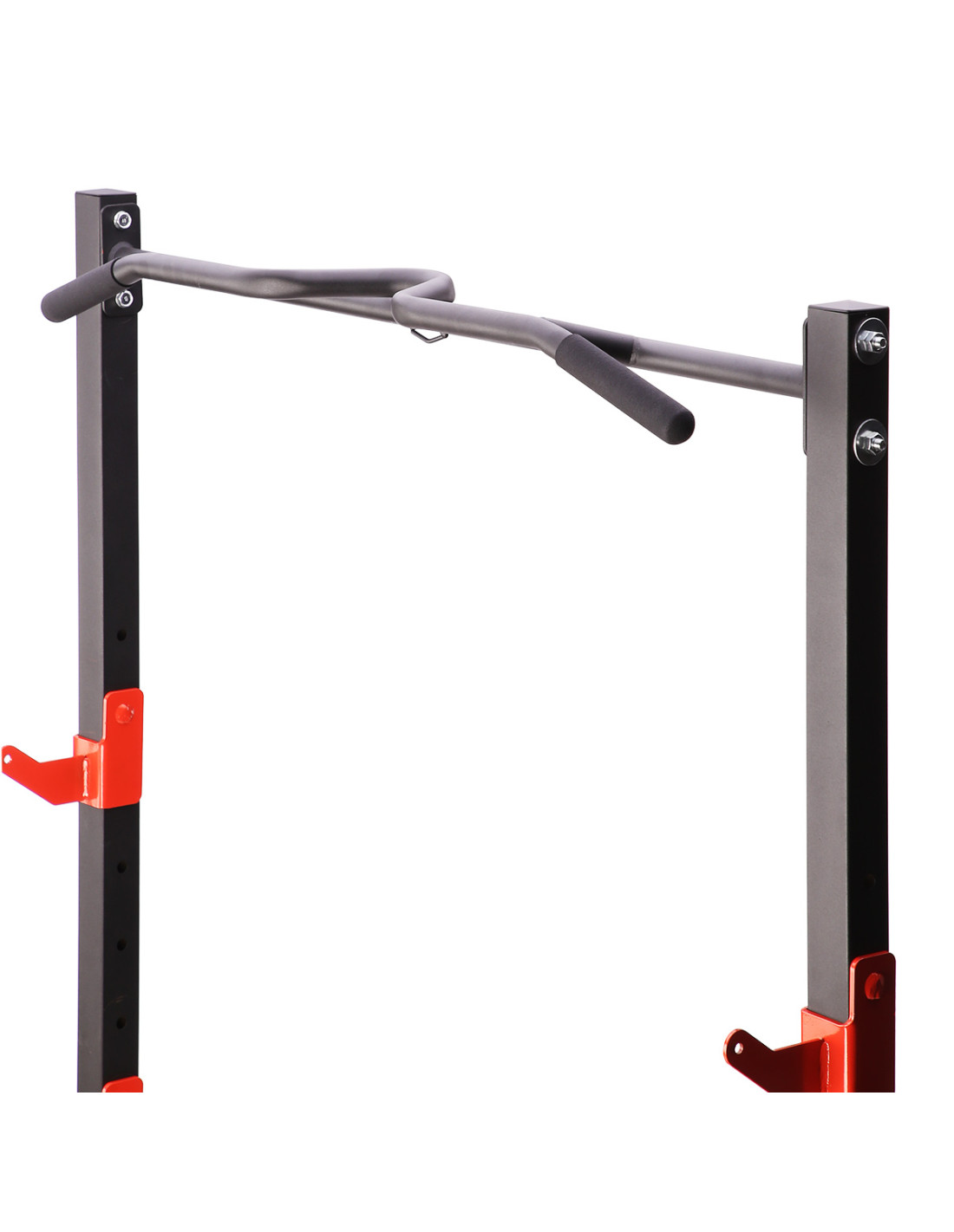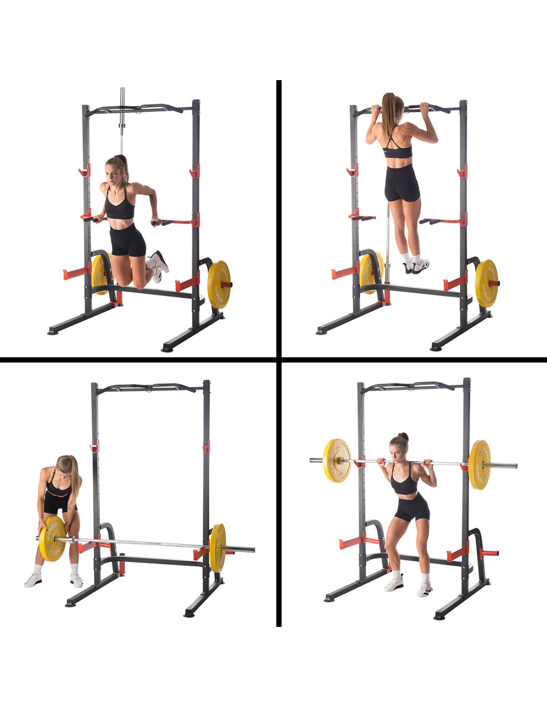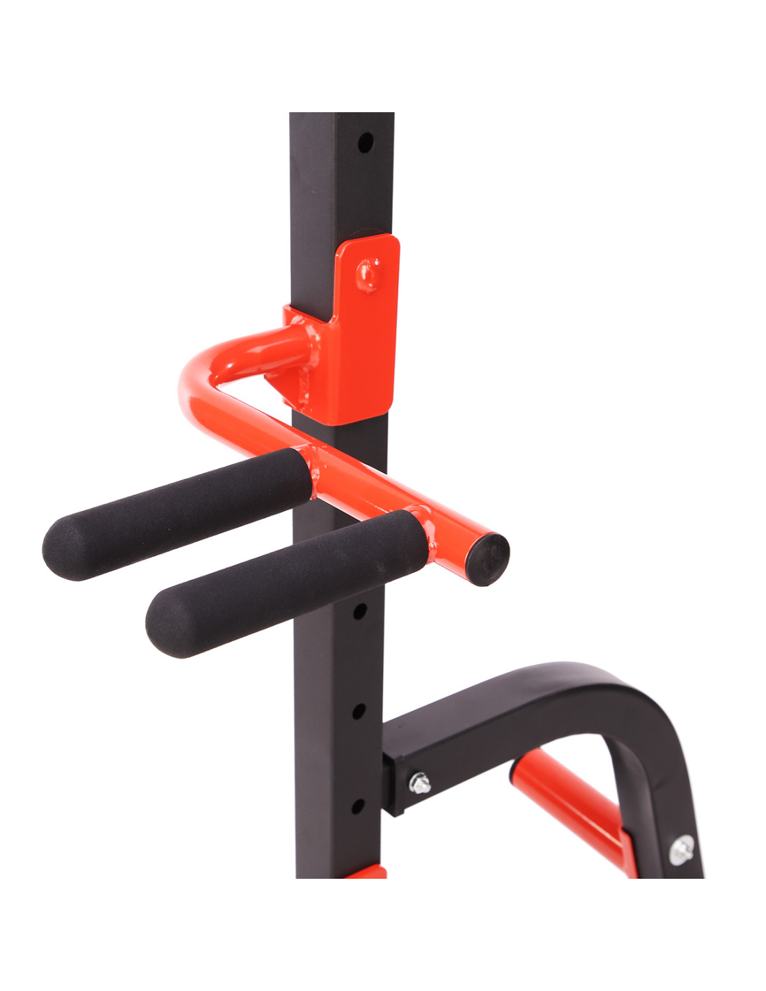 Dank dem benutzerfreundlichen 14-stufigen System der Höhenverstellung von Griffen, Dip-Station und Sicherheitshaken können Sie den Ständer an Ihre Bedürfnisse anpassen.