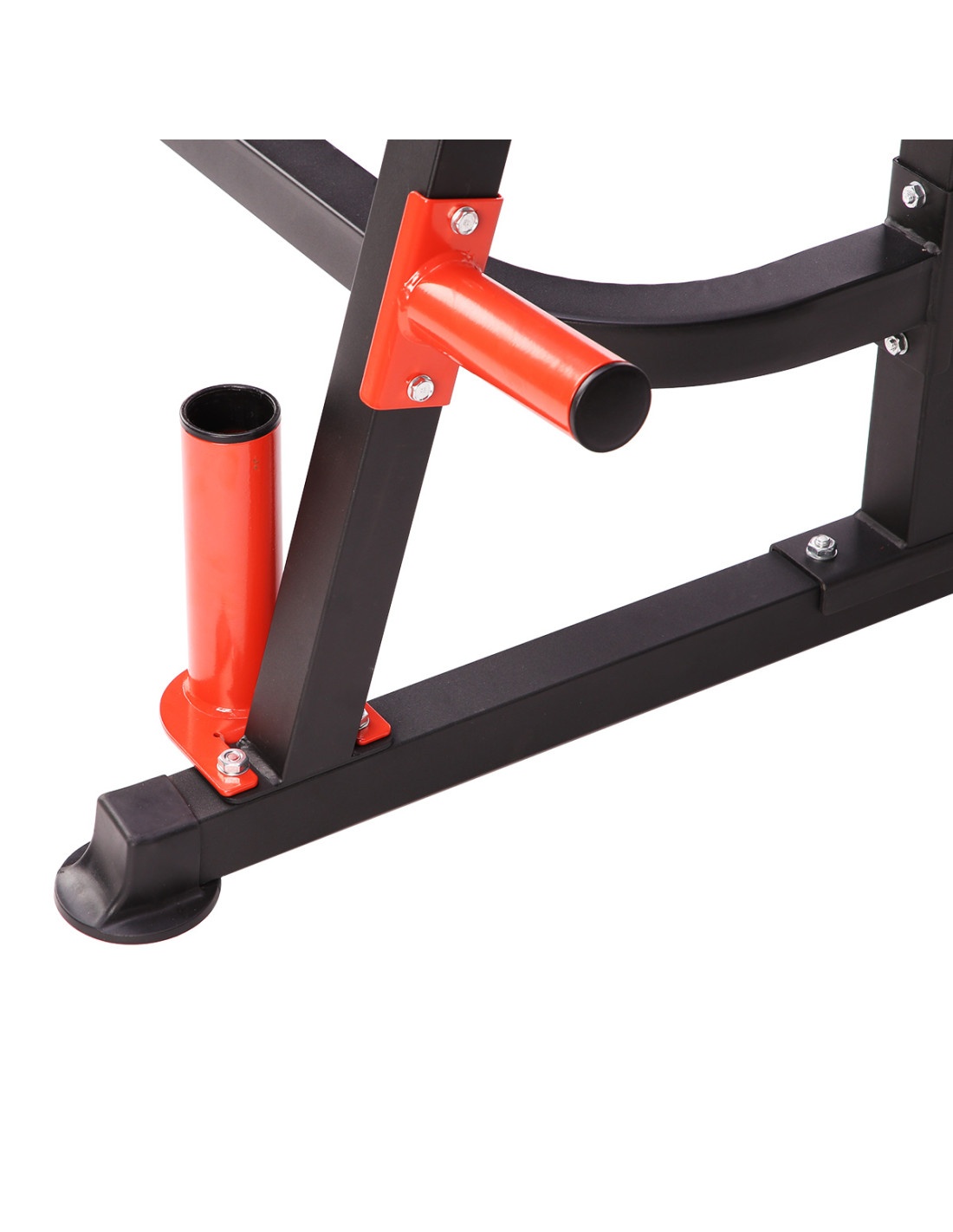 Der Ständer ist mit zusätzlichen Haken zum Aufbewahren von Hantelscheiben und mit einem Griff für Langhantelstange ausgestattet. Dies erleichtert es, die Ordnung in einem Fitnessstudio zu halten und macht den Raum für Ausrüstung kleiner. Außerdem wird die Änderung der Hantelscheiben einfacher.