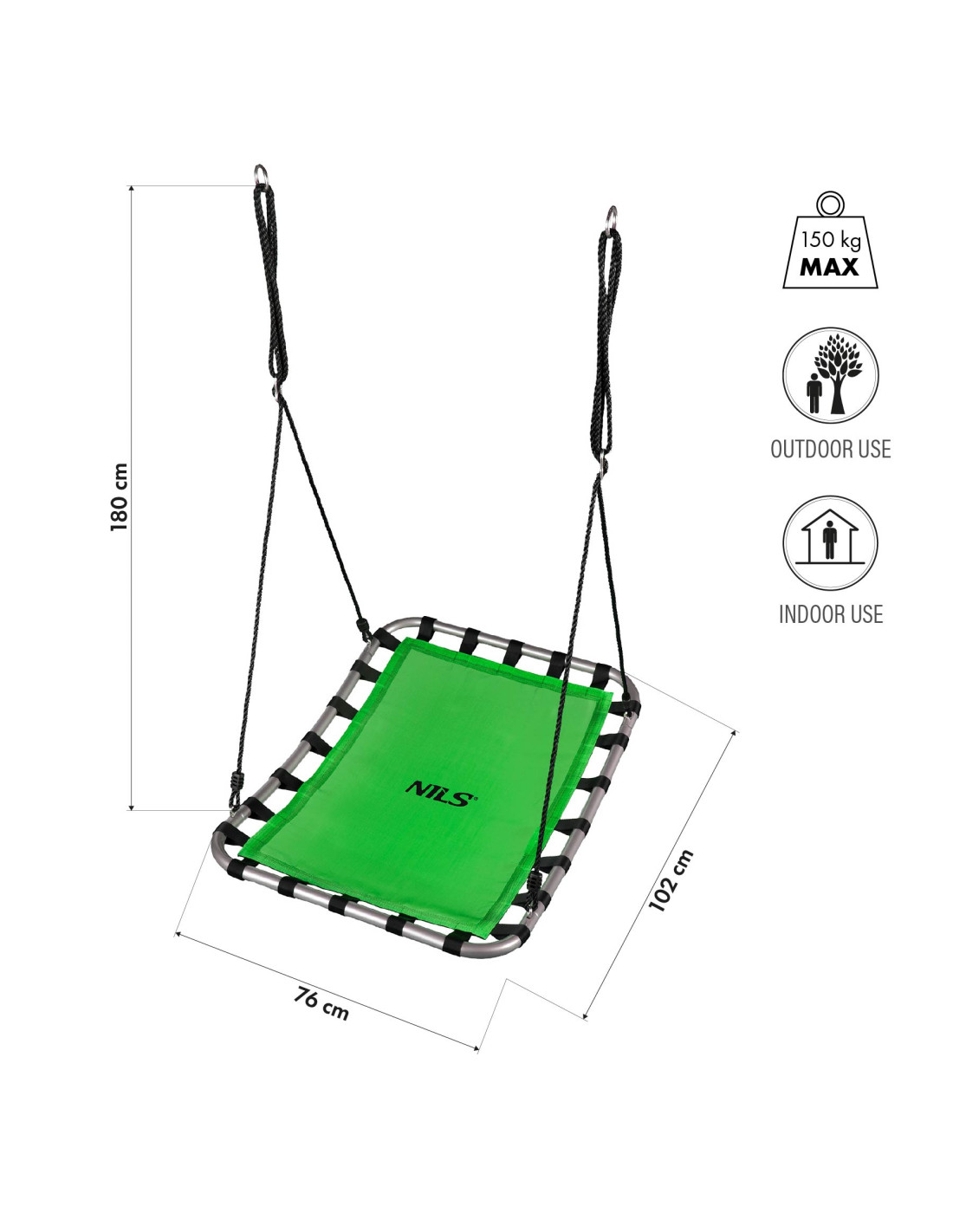 Dank ihrer rechteckigen Abmessungen von 102 × 76 cm bietet die Schaukel NB5045 eine bequeme Sitz- und Liegefläche, sogar für zwei Kinder gleichzeitig. Durch die kompakten Abmessungen nimmt die Schaukel nicht viel Platz ein, bietet aber dennoch ausreichend Komfort. Sie ist perfekt für Orte, an denen der Platz begrenzt ist, man aber nicht auf Spaß verzichten möchte.