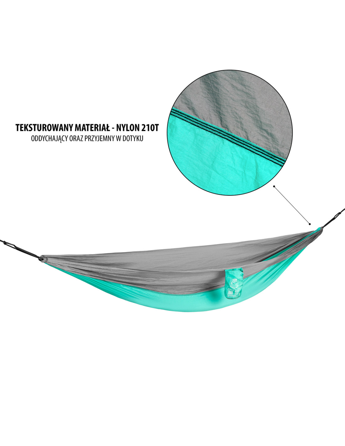 Der Stoff, aus dem die Hängematte hergestellt wurde, ist Nylon 210T. Er ist sehr robust sowie fühlt sich gut an. Seine atmungsaktive Struktur garantiert den Benutzungskomfort und die Hängematte ist dadurch schnelltrocknend. Außerdem ist das Material wetterbeständig und verformungsfest.