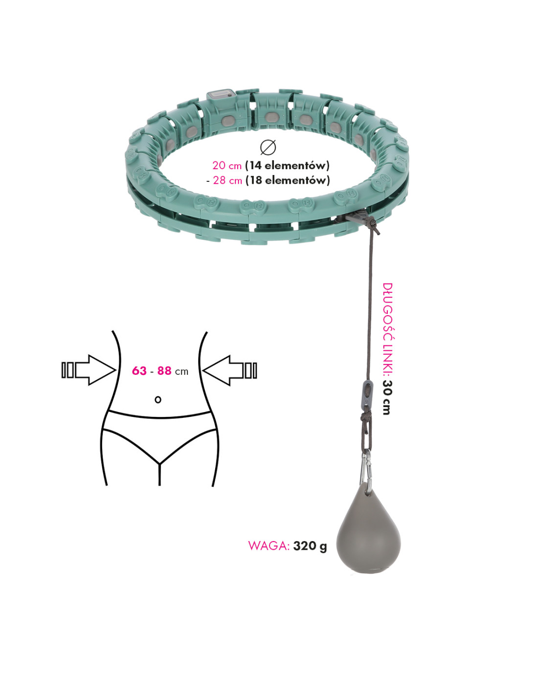 FH03 HMS ist ein verstellbarer Hula-Hoop-Reifen mit stoßdämpfenden Massagepunkten und einem Schwerkraftball. Er ermöglicht es, gleichzeitig Training und Massage der Taille zu machen. Er ist perfekt u.a. für Stärkung und Kräftigung der Muskeln. Dank der Anpassung an die Taillenweite ist FH03 ideal für jede Körperfigur! Dieses Produkt ist sowohl für Kinder als auch für Erwachsene bestimmt.